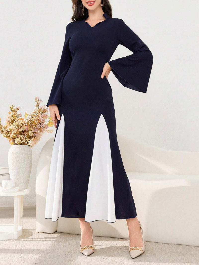 Women's Stand Collar Cinched Waist Minimalist Flare Sleeve Bodycon Midi Dress
