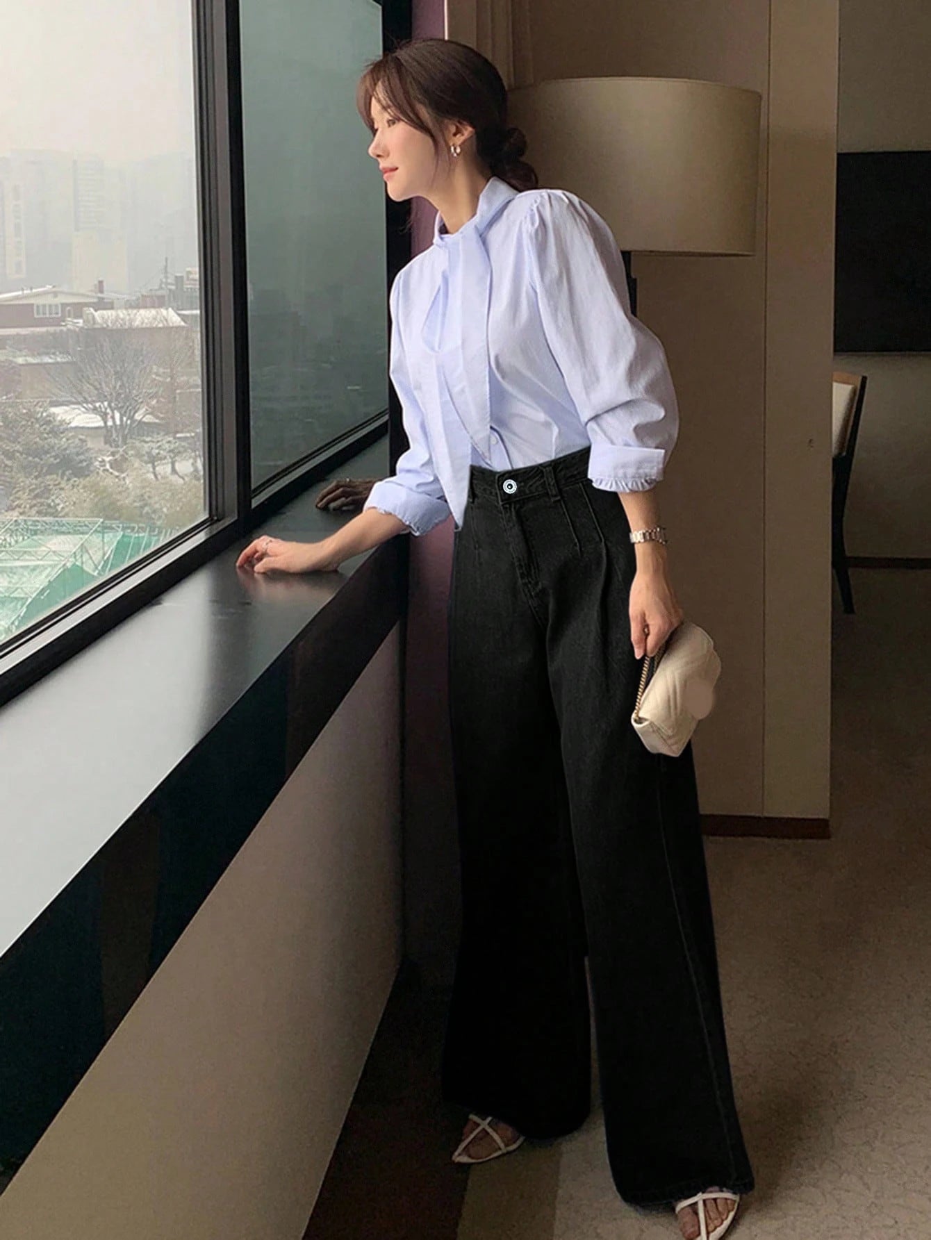 DAZY High Waist Washed Blue Pleated Wide Leg Jeans