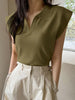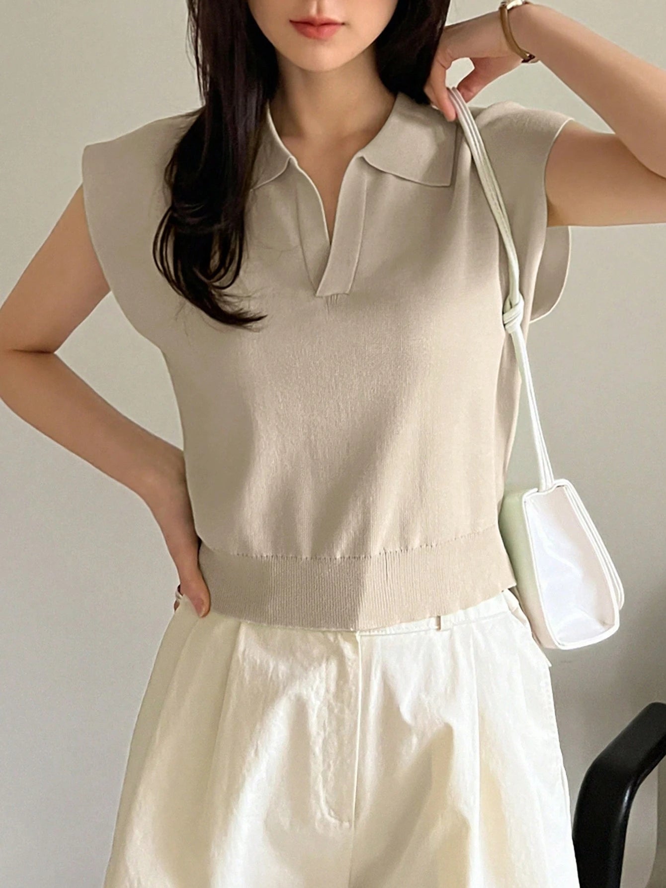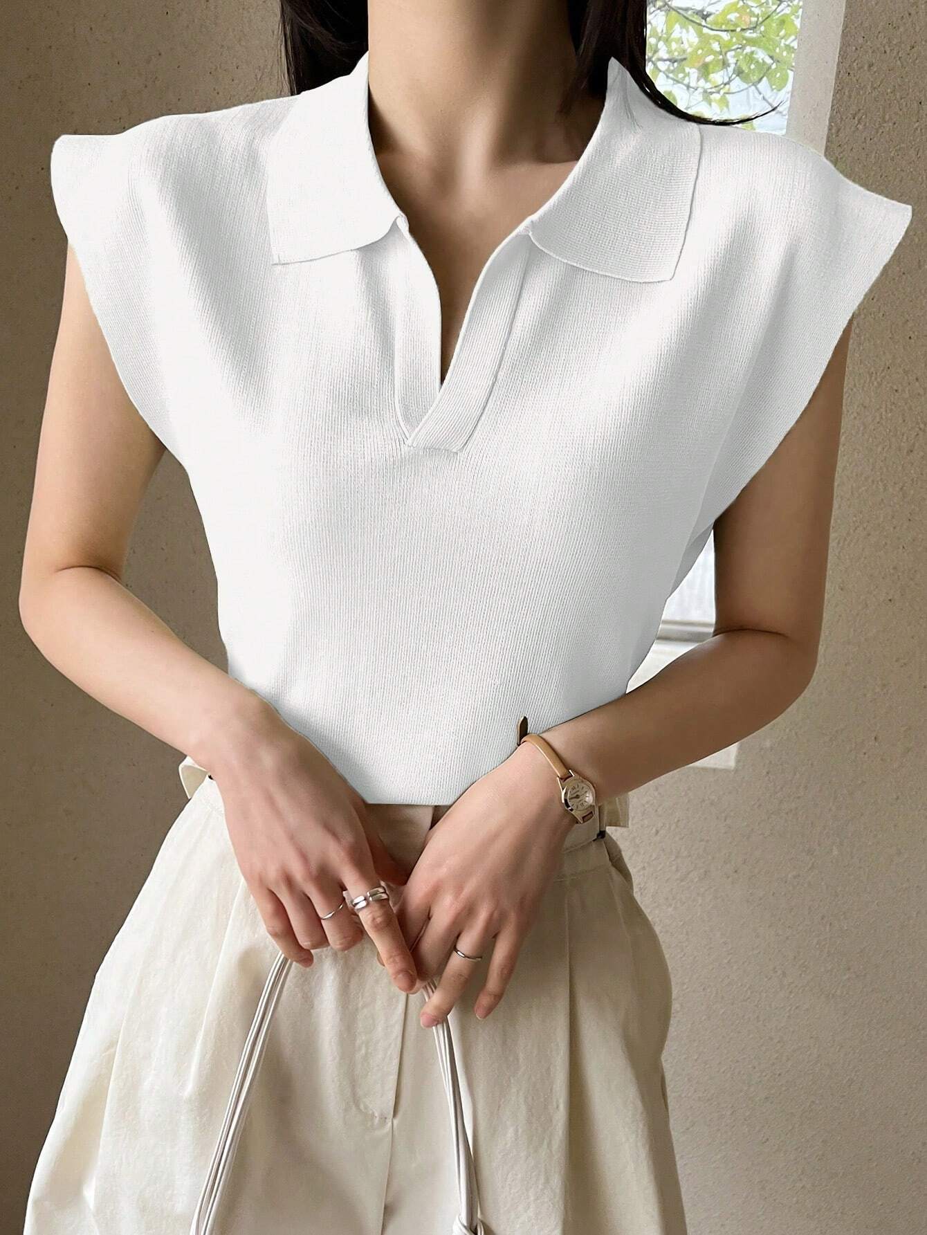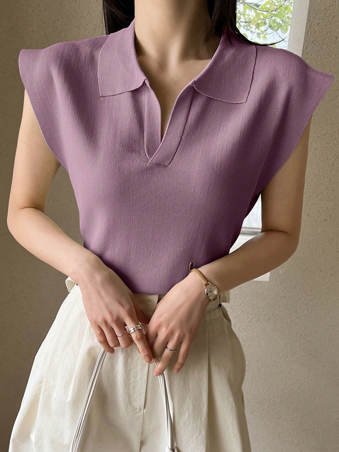 Neckline: CollarHem Shaped: RegularDetails: Rib-KnitPattern Type: PlainStyle: CasualBody: UnlinedSleeve Type: Batwing SleeveLined For Added Warmth: NoSleeve Length: Cap SleeveLength: RegularFit Type: Regular FitFabric Elasticity: Medium StretchMaterial: Fabric