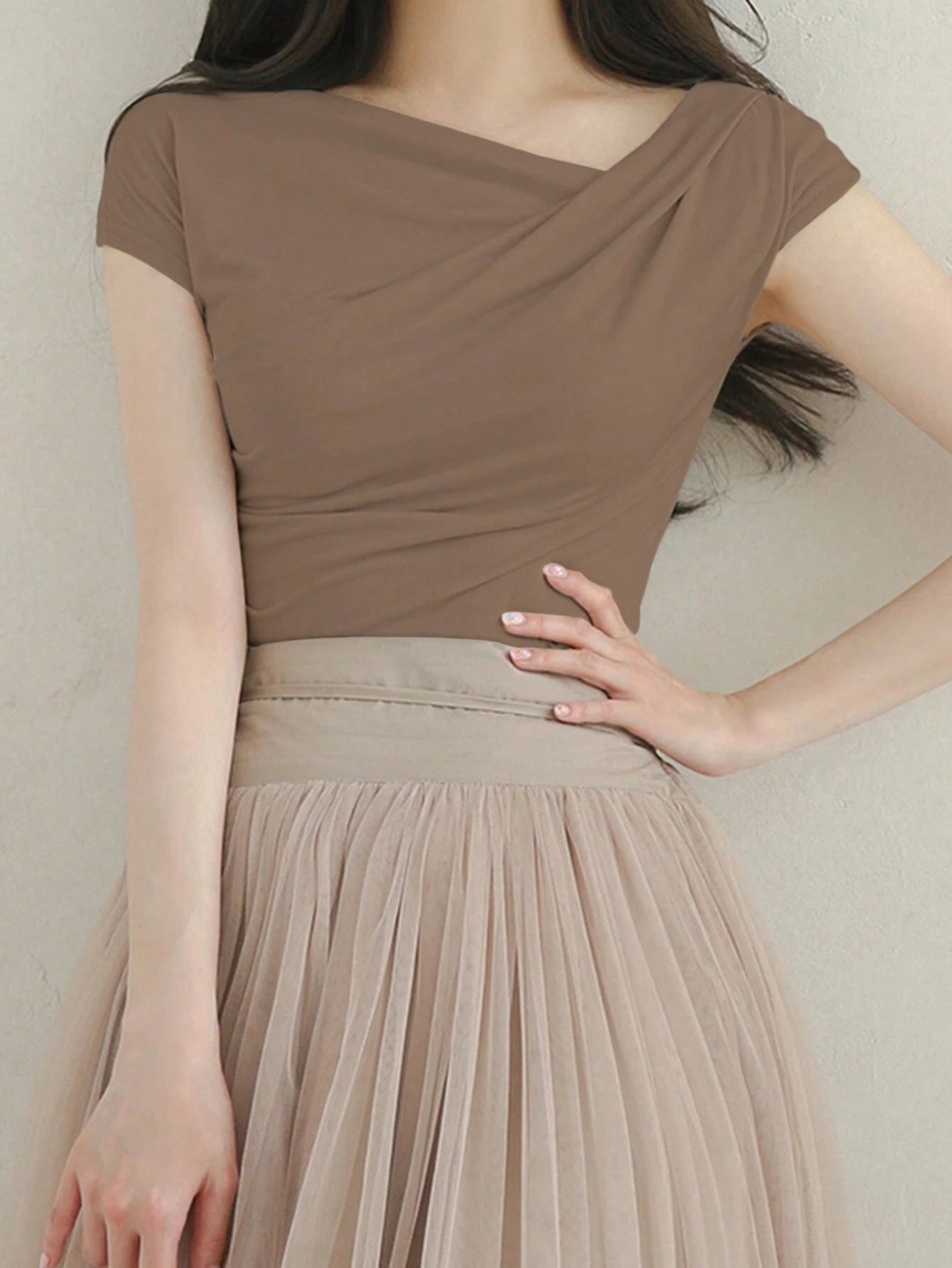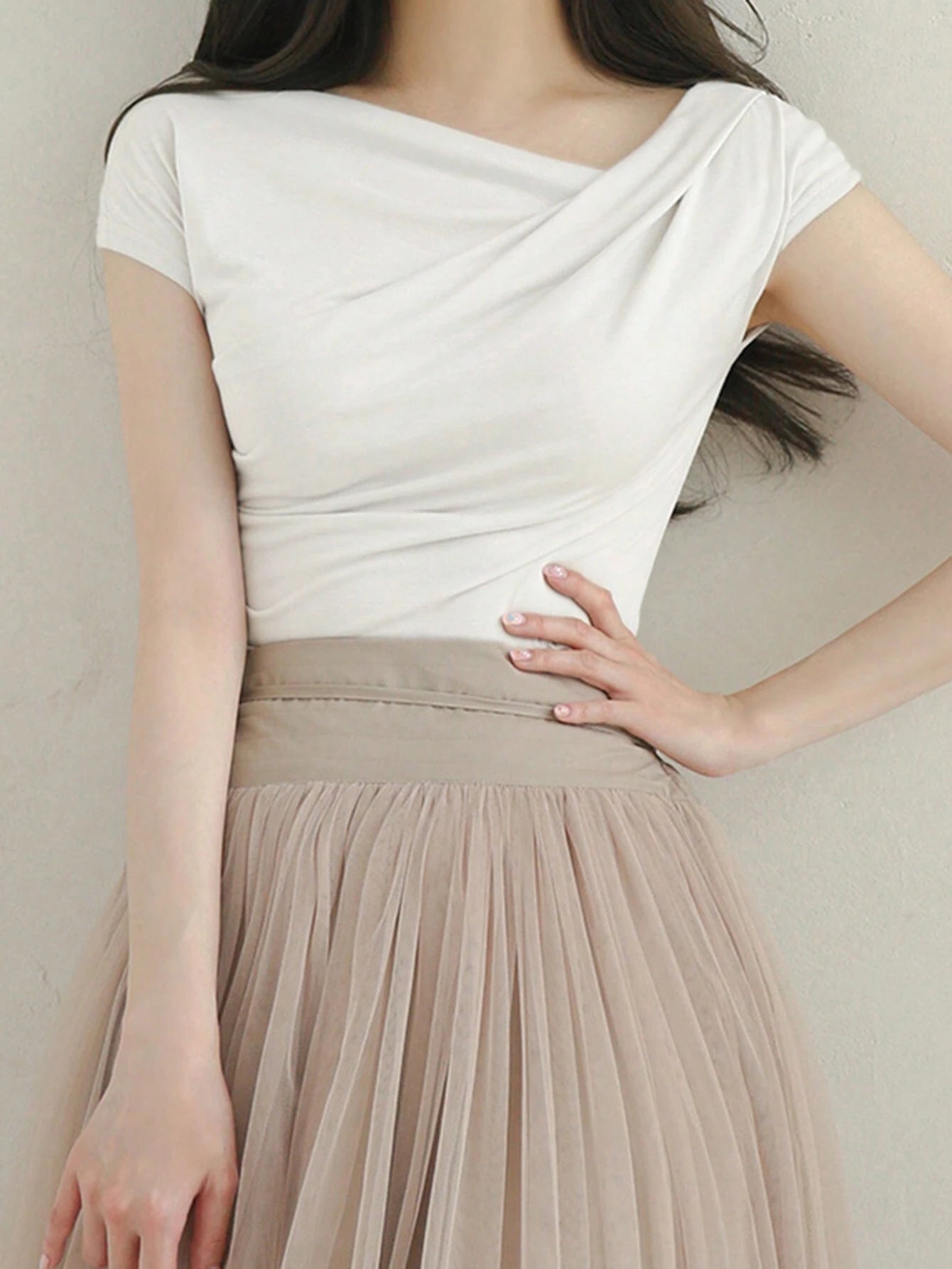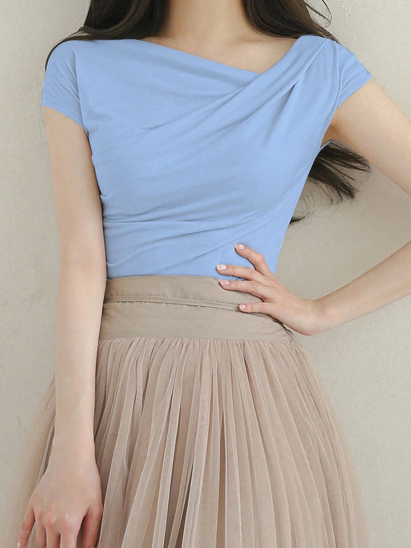 DAZY Women's Summer Solid Color Asymmetrical Collar Slim Short Sleeve T-Shirt