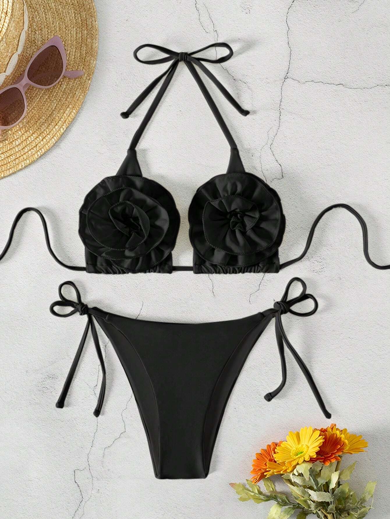 SXY Women's Halter Neck Tied Back Floral Print Bikini Set With Side Tie Bottoms