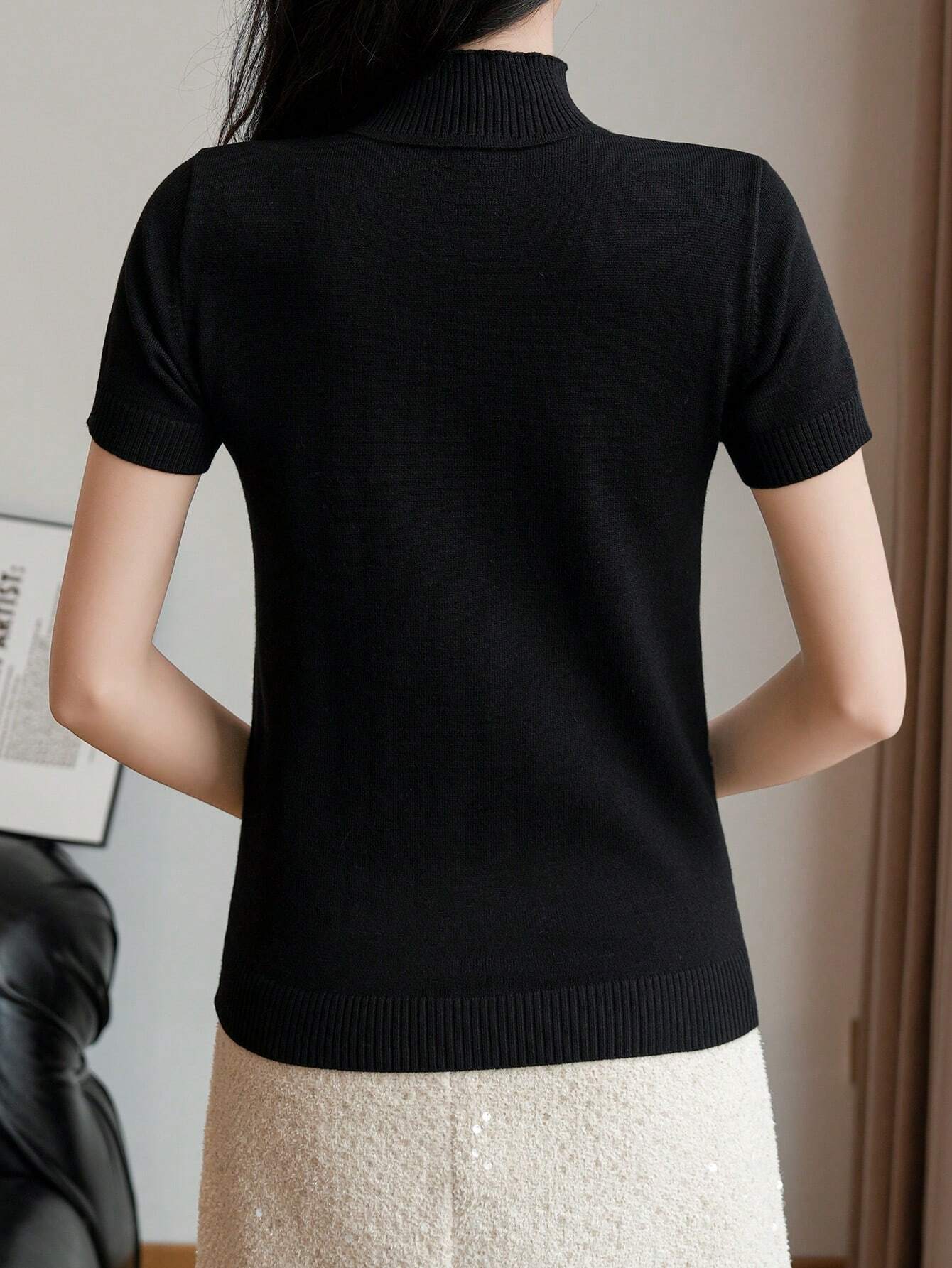 Women Casual Solid Color Turtleneck Slim Fit Short Sleeve Knit Top